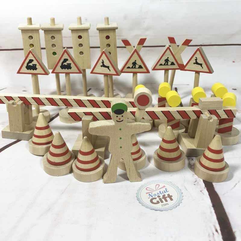 Assortiment de panneaux et objets de signalisation en bois
