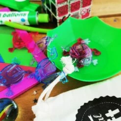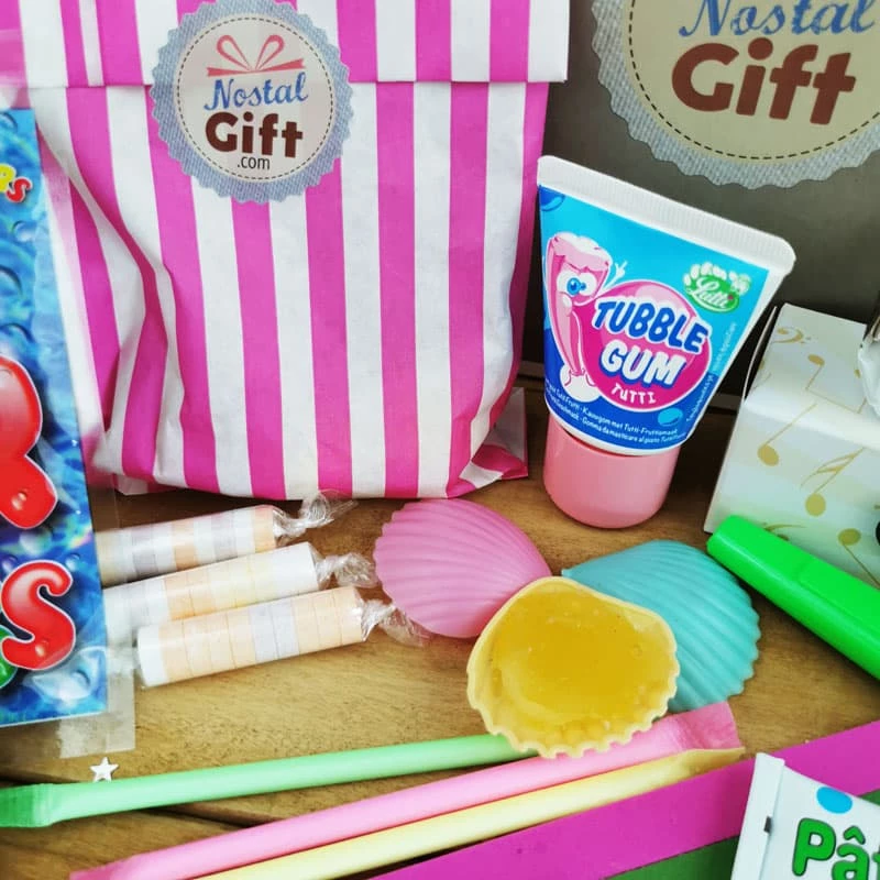 10 – Un sachet de bonbons avec : 2 roudoudous , 1 fruit à la poudre acidulée, 1 chewing-gum en tube “tubble gum” et 3 Fizzy roll et un gâteau Yes