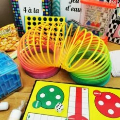 – Une boîte les petits jouets des années 80 avec un mini jeu de carte, un parachutiste, un mini ondamania smiley, une balle comète, un acrobat et une main collante