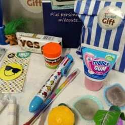 10 – Un sachet de bonbons avec : 2 roudoudous , 1 fruit à la poudre acidulée, 1 chewing-gum en tube “tubble gum” et 3 Fizzy roll et un gâteau Yes