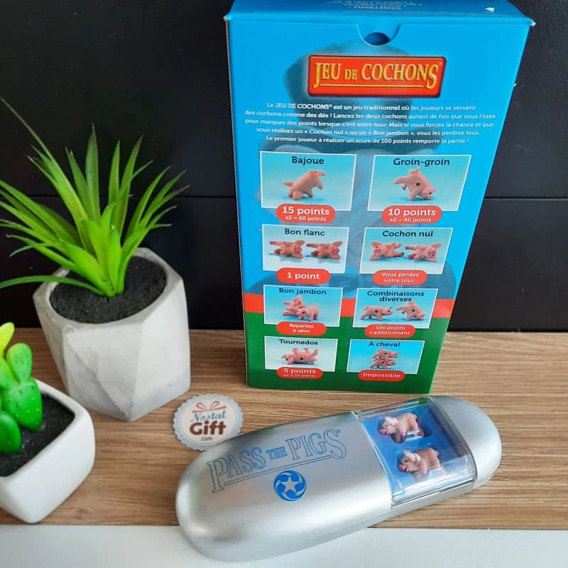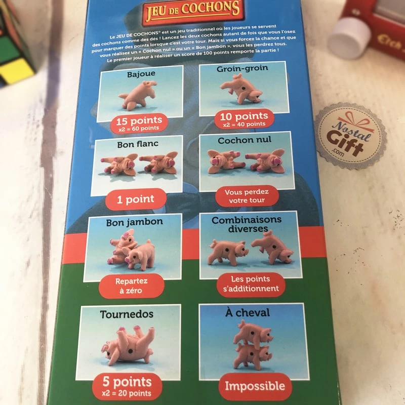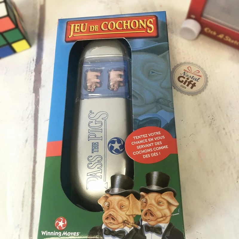 – Contenu : 1 étui de rangement, 2 petits cochons roses en plastique, un bloc de marque, 2 crayons, 1 règle du jeu