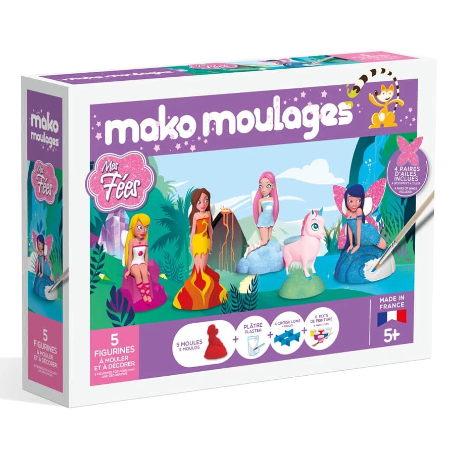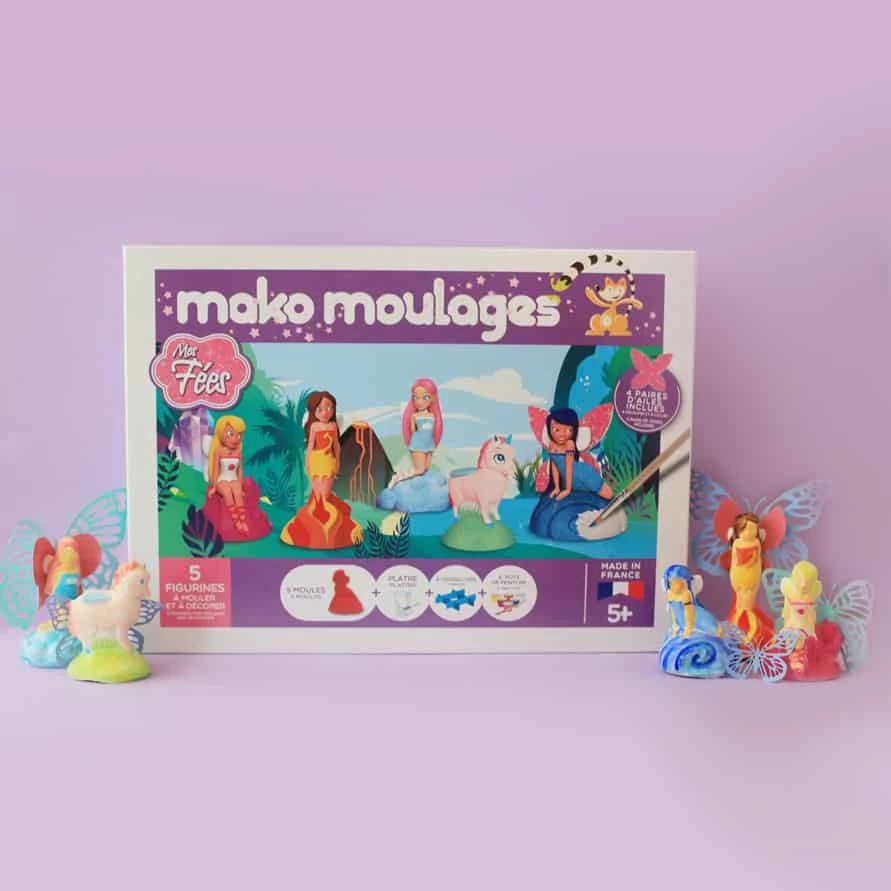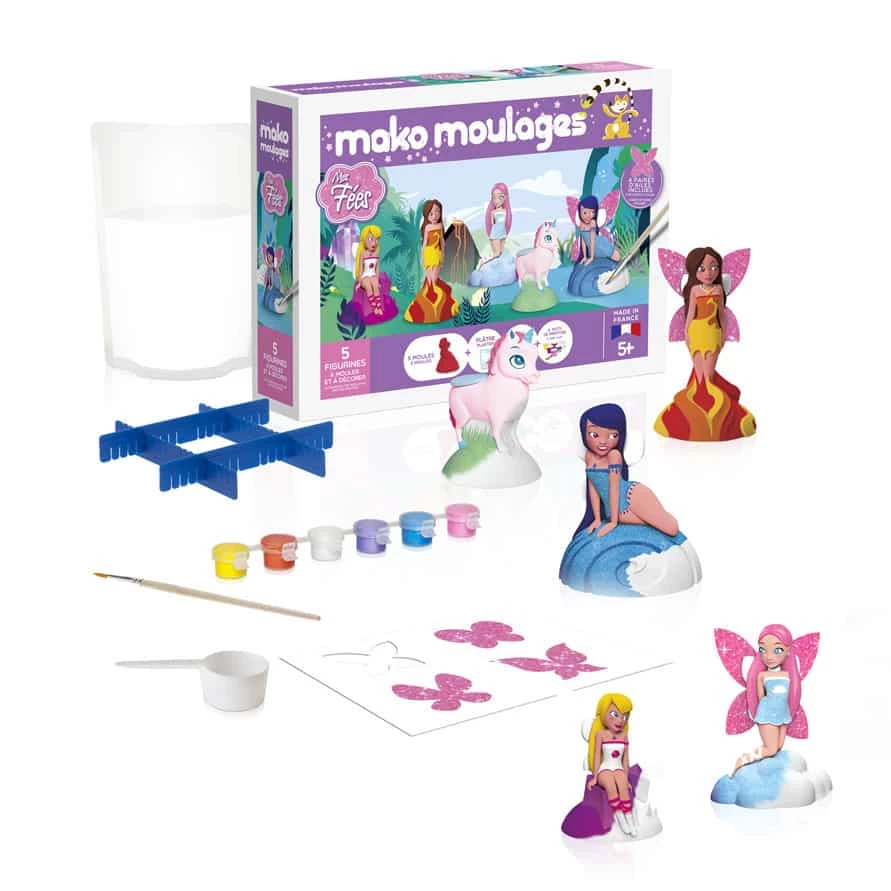 – Le coffret contient : 5 moules de fées + 1 moule de licorne, 6 pots de peinture (certaines peintures sont pailletées), 1 pinceau, 1 sachet de plâtre refermable zippé, des croisillons pour tenir les moules, 1 cuillère doseuse et 4 paires d’ailes scintillantes à découper et coller.