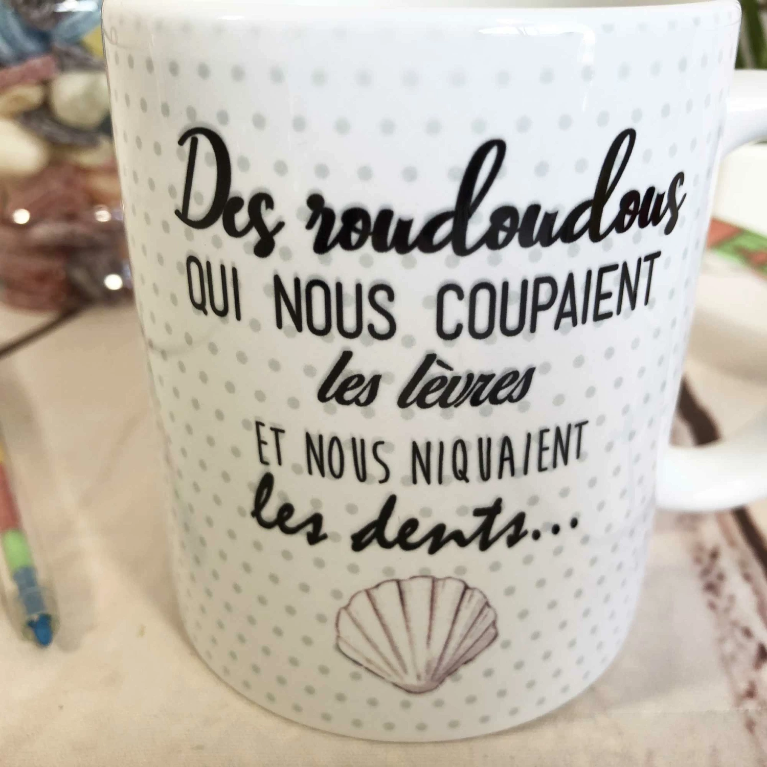 Mug “Des roudoudous qui nous coupaient les lèvres et nous niquaient les dents” remplie de bonbons rétro