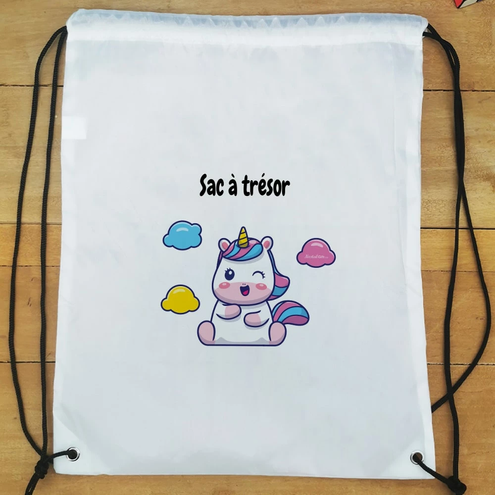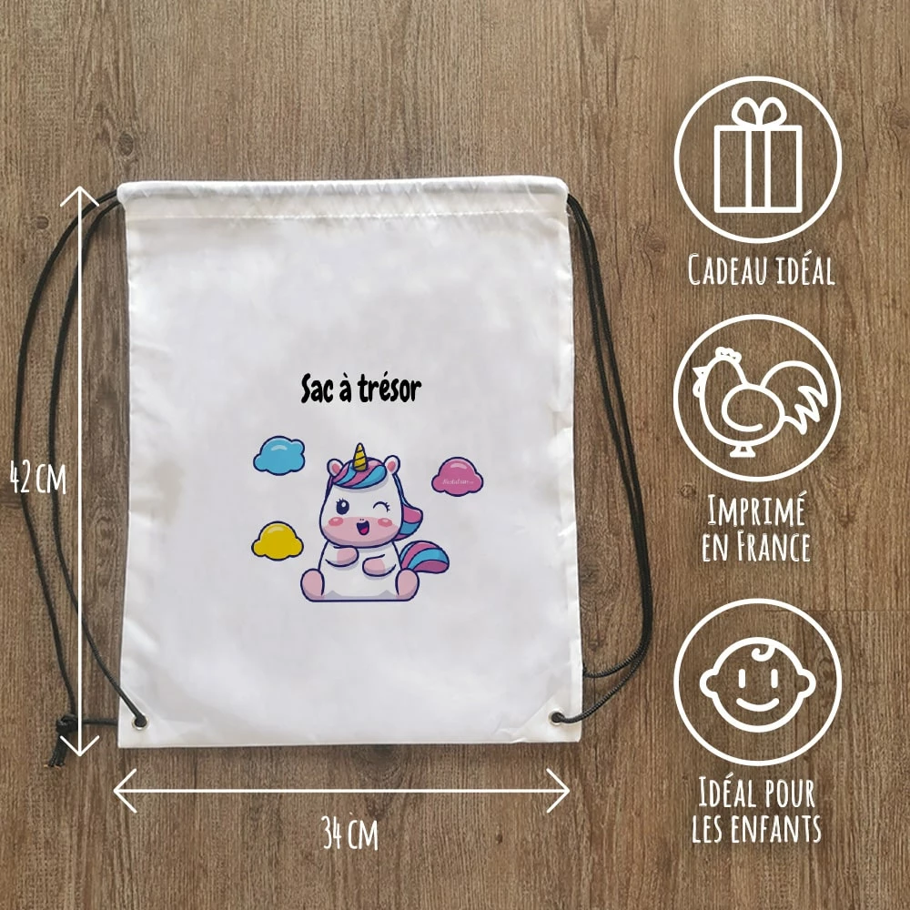 Sur ce sac de gym, il sera écrit “Sac à trésor” sur l’avant. En polyester et une fermeture facile grâce à ses cordons, ce sac est simple d’utilisation et ne craint pas l’eau qui pourrait couler de la gourde ou du maillot de bain.