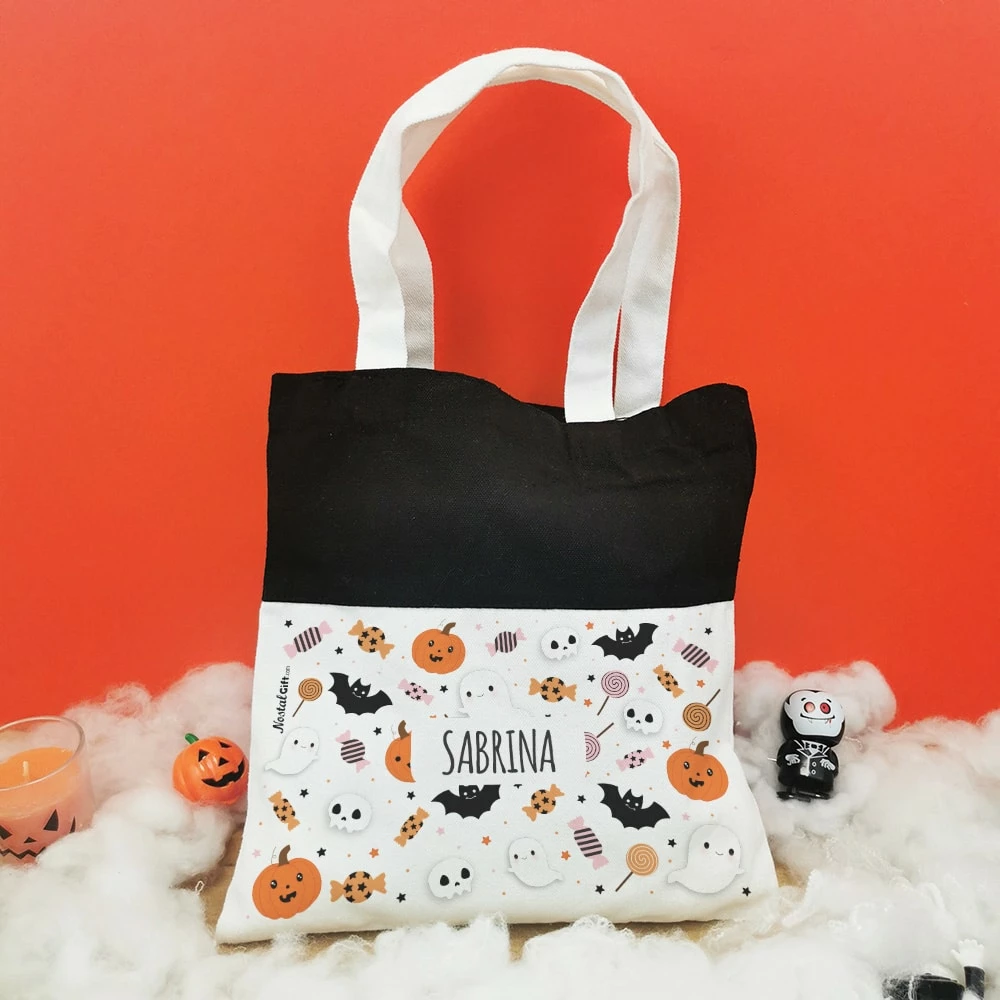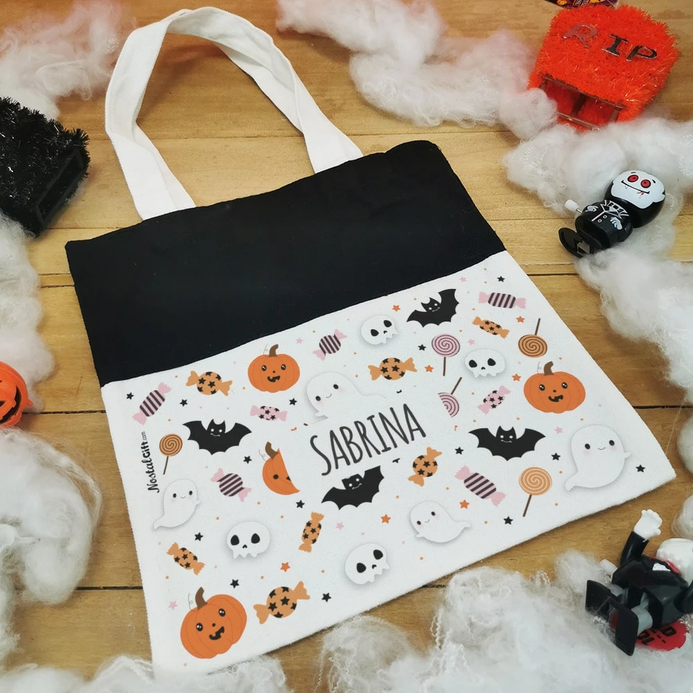 La chasse aux bonbons pour Halloween va bientôt commencer ! Votre enfant sera bien équipé avec ce très joli sac personnalisé. N’hésitez pas à consulter nos bonbons Halloween pour remplir ce sac de douceurs !