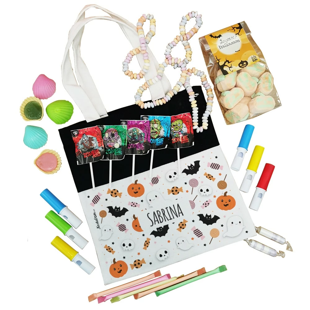 La chasse aux bonbons pour Halloween ne pourrait se passer de ce sac personnalisé au prénom de votre enfant ! Votre enfant sera bien équipé avec ce très joli sac au design de citrouilles, chauve souris, bonbons, fantômes…et en plus il sera ravi de déguster nos meilleurs confiseries (Collier, roudoudou, sucette, sifflet, guimauve…). N’hésitez pas à consulter nos bonbons Halloween pour compléter ce sac de douceurs !