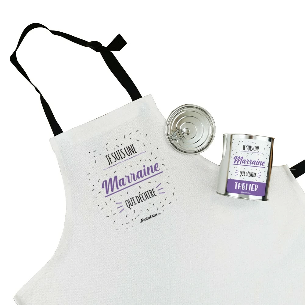 Tablier de cuisine dans sa boîte de conserve – “Je suis une une marraine qui déchire
