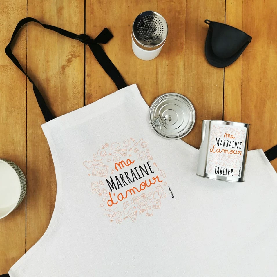 Tablier de cuisine dans sa boîte de conserve – “Ma marraine d’amour” – Cadeau Marraine