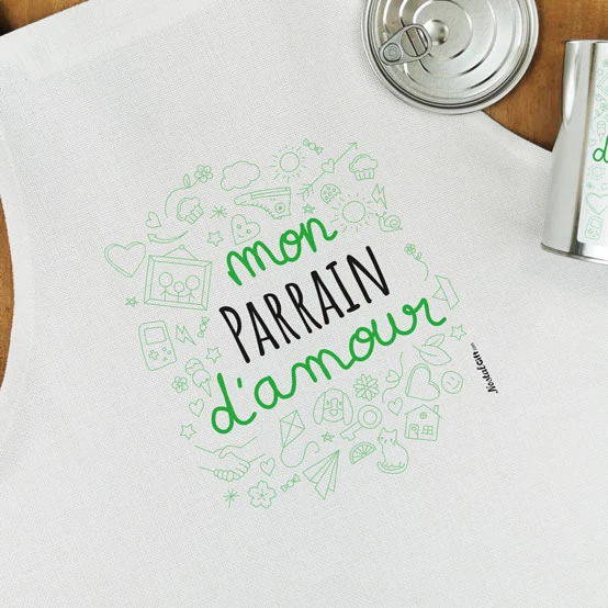 Tablier de cuisine dans sa boîte de conserve – “Mon Parrain d’amour” – Cadeau Parrain
