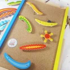 – Contient : 3 billes, 20 pièces en bois colorées et des clous