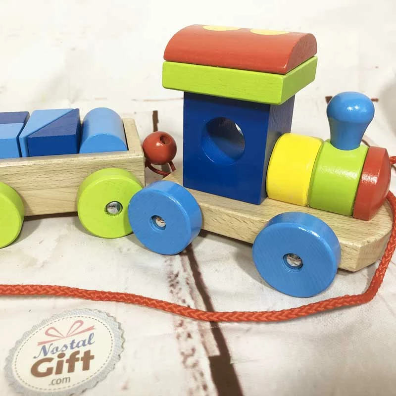 – Contient : un train de bois avec 3 wagons + 14 blocs de construction à emboîter dans les wagons